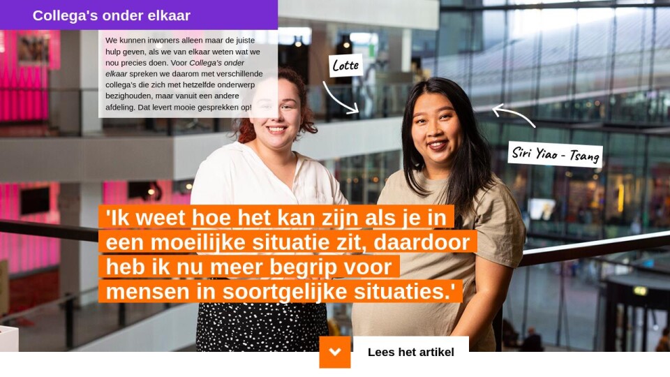 We kunnen inwoners alleen maar de juiste hulp geven, als we van elkaar weten wat we nou precies doen. Voor Collega’s onder elkaar spreken we daarom met verschillende collega’s die zich met hetzelfde onderwerp bezighouden, maar vanuit een andere afdeling. Dat levert mooie gesprekken op!